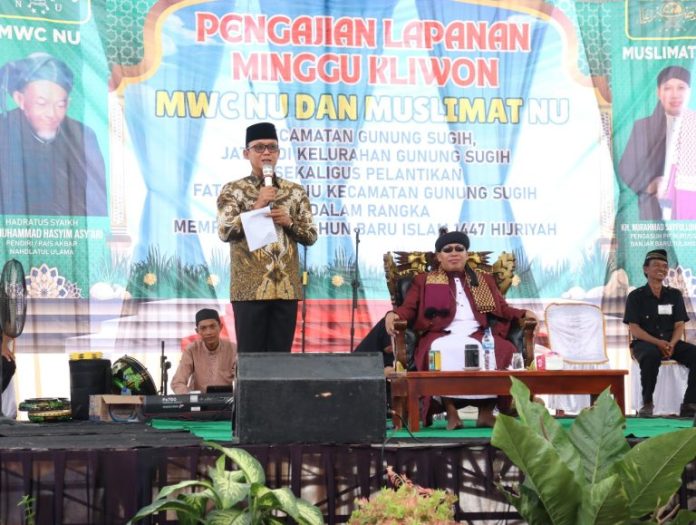 Bupati Lampung Tengah, Ardito Wijaya, menghadiri pengajian Minggu Kliwon yang diselenggarakan oleh Majelis Wakil Cabang Nahdlatul Ulama (MWC NU) dan Muslimat NU Kecamatan Gunung Sugih. Acara berlangsung di Banjar Mulyo, Kelurahan Gunung Sugih, pada Minggu (27/7/2025).