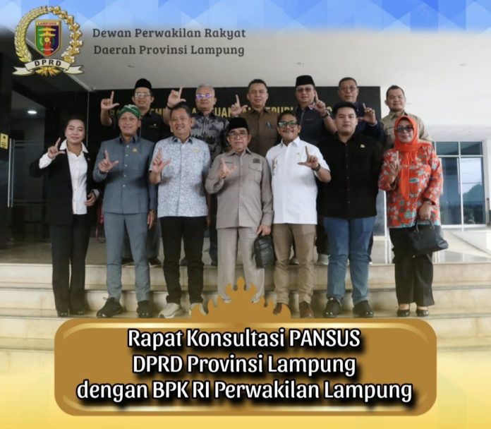 Lampung – Panitia Khusus DPRD Provinsi Lampung melakukan kunjungan kerja ke Kantor Badan Pemeriksa Keuangan (BPK) RI Perwakilan Lampung dalam rangka rapat konsultasi terkait pembahasan Laporan Hasil Pemeriksaan (LHP) BPK atas pengelolaan Anggaran Pendapatan dan Belanja Daerah (APBD).