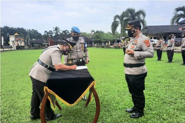 Serah terima jabatan (sertijab) para pejabat kepolisian itu berlangsung di halaman Mapolres Lamtim, Rabu (13/7/2022). Dimpimpin Kapolres AKBP Zaky Alkazar Nasution.