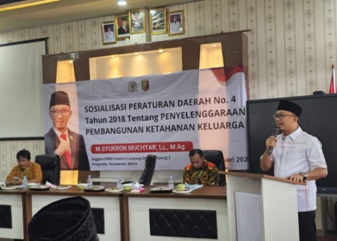 Metro — “Penguatan ketahanan keluarga sebagai fondasi utama dalam membangun masyarakat dan negara yang kuat. Sehingga, dalam sosialisasi Perda Nomor 4 Tahun 2018, Saya memilih pendekatan yang dinilai strategis dengan menyasar para guru ngaji sebagai peserta”, demikian disampaikan Anggota DPRD Provinsi Lampung M. Syukron Muchtar, saat melaksanakan Sosialisasi Peraturan Daerah (Perda) Nomor 4 Tahun 2018 tentang Penyelenggaraan Pembangunan Ketahanan Keluarga, di Aula SMK Muhammadiyah Metro Timur, Sabtu (25/01/2026).